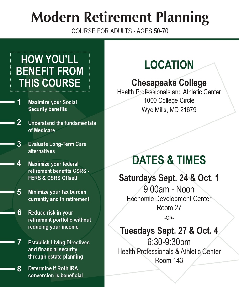 Modern Retirement Planning™ is a six hour educational course for adults ages 50 - 70+ and will cover the latest concepts and strategies for structuring a successful retirement plan. In today's financial world, having an understanding of what it takes to plan for a retirement that could easily span 20+ years is essential. There are 2 course dates (2 sessions each). Dates are Saturdays: September 24 and October 1st - 9:00 am - Noon or Tuesdays: September 27th and October 4th - 6:30 pm - 9:30 pm. Dates are interchangeable upon request. Tuition is $59 which includes a guest at no additional charge, and one workbook. Advance registration is required: Click here to register
