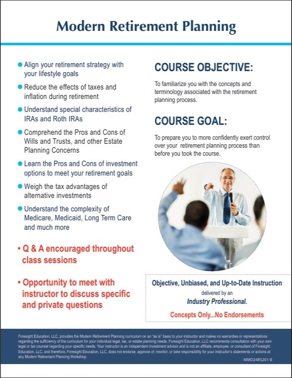 Modern Retirement Planning™ is a two-session, five-hour educational course for adults ages 50 - 70+ covering the latest concepts and strategies for structuring a successful retirement plan. In today's financial world, understanding what it takes to plan for a retirement that could easily span 20+ years is essential. The course's two sessions are each 2.5-hours long. Session 1 is on Thursday, November 7 from 6:30 p.m. to 9:00 p.m. and Session 2 is on Thursday, November 14 from 6:30 p.m. to 9:00 p.m. Tuition is $59, which includes a guest at no additional charge and one workbook. Advance registration is required: Click here to register